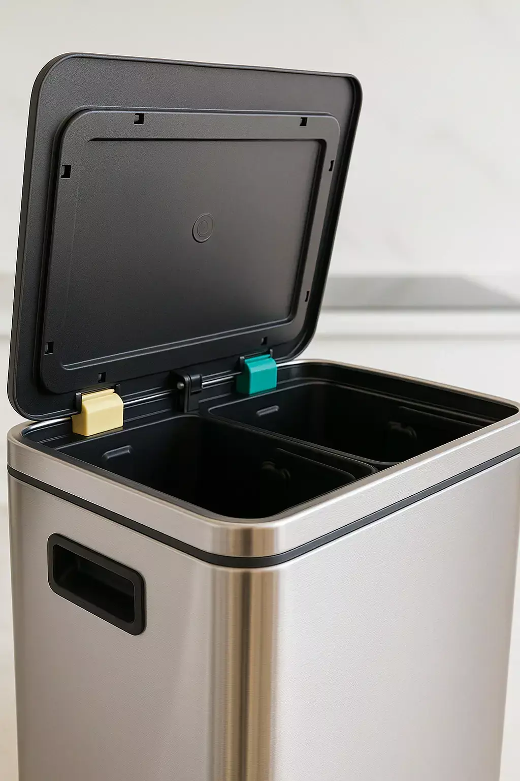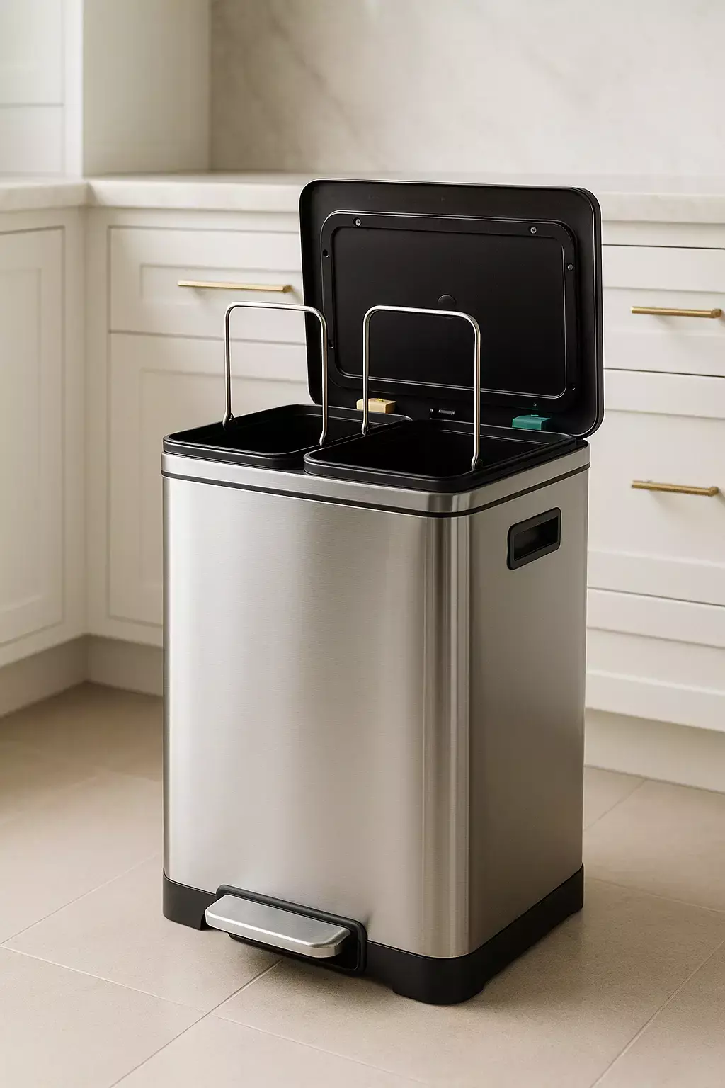 Este cesto doble extraíble está diseñado para facilitar la gestión de residuos y reciclaje en tu hogar o espacio de trabajo.