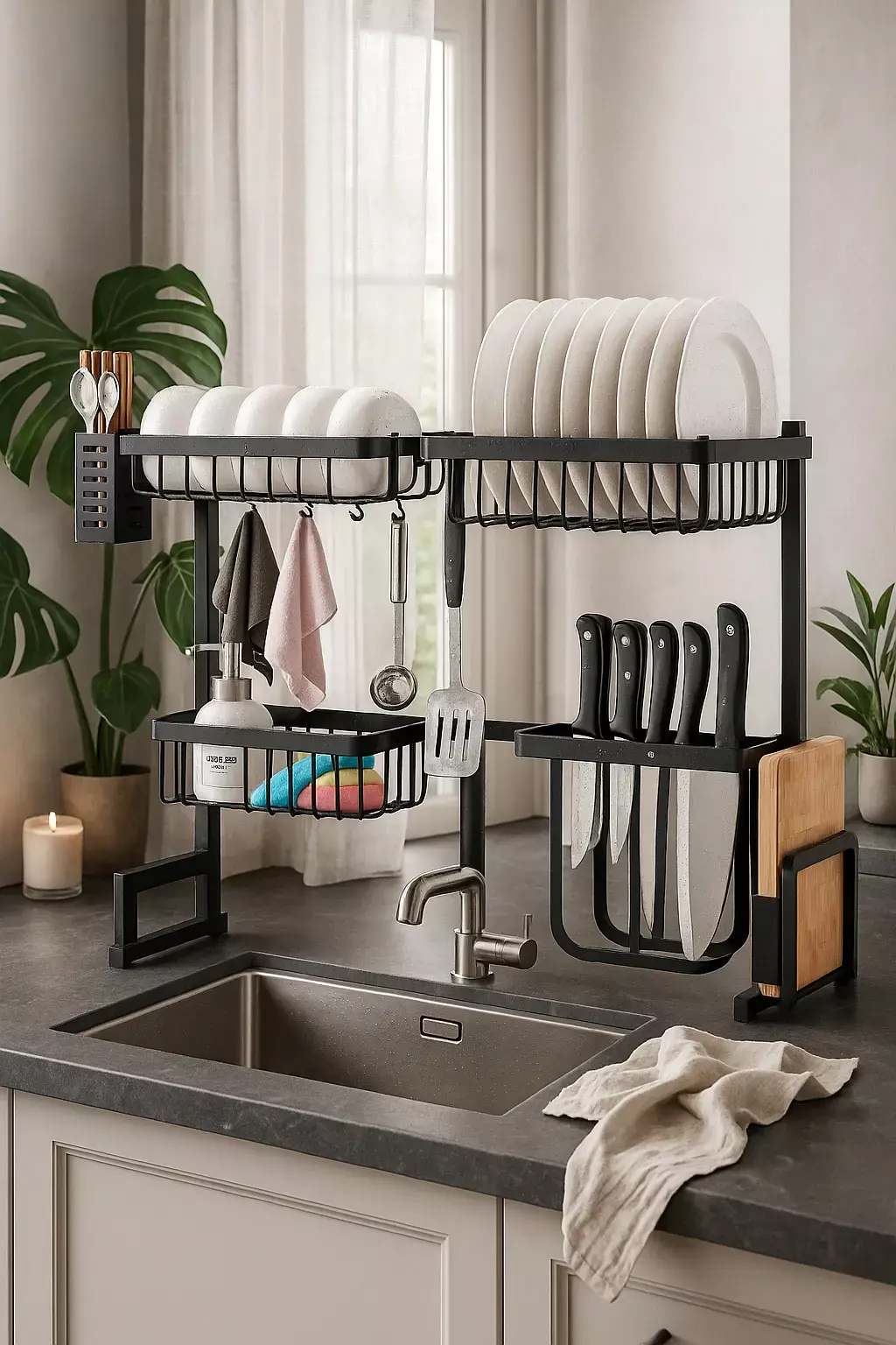El Escurreplatos de Bacha en acero inoxidable negro es la solución ideal para mantener tus platos y utensilios organizados y secos después del lavado. Su diseño pensado para colocarse sobre la bacha optimiza el espacio y facilita el escurrido, combinando funcionalidad y resistencia en un solo producto.